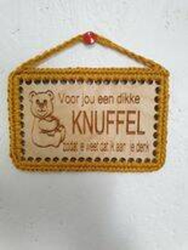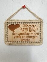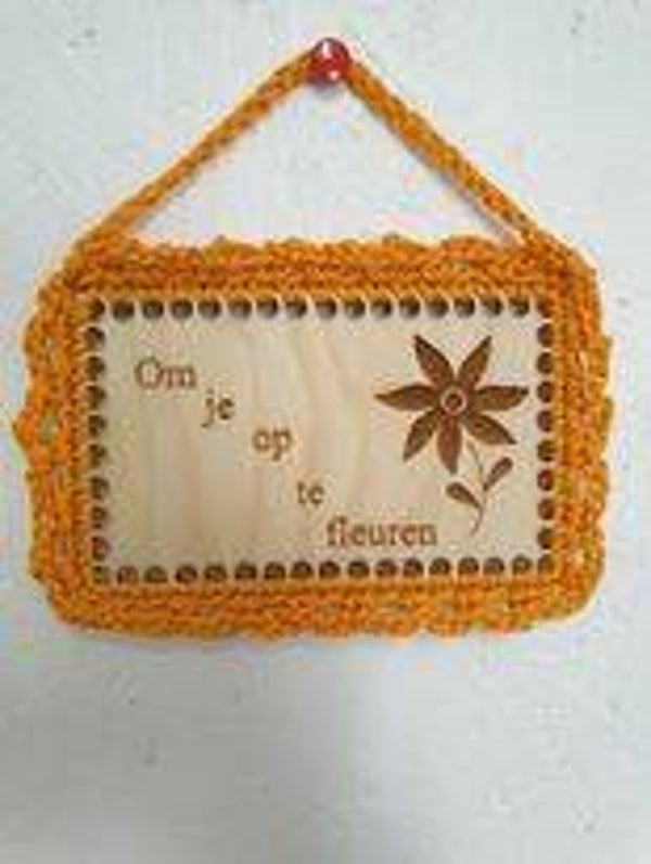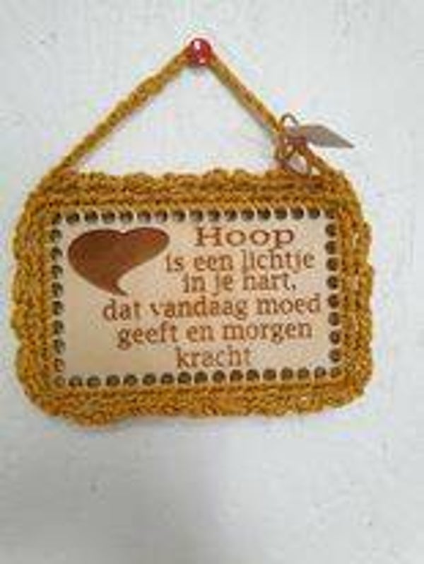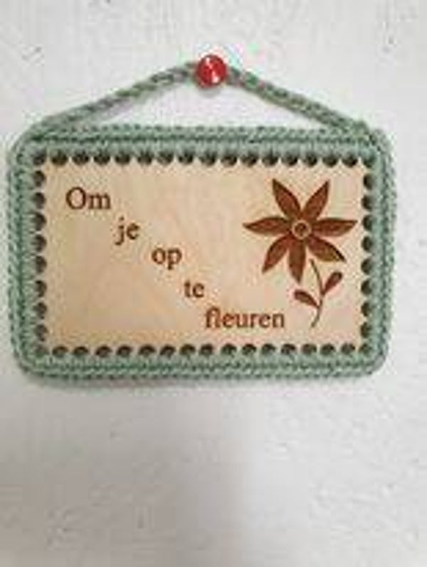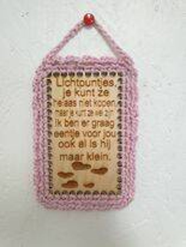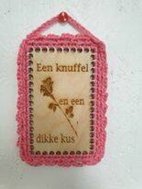 Omhaakte houten kaartjes met verschillende teksten op. Deze kaartjes kan je aan iemand schenken die door een moeilijke periode gaan, of aan iemand die je lief hebt. Je kan aan de achterkant zelf nog iets schrijven, er is een envelop bij om het eventueel te verzenden. Kaartjes zijn 8,5 op 13cm en hebben ook een gehaakte lus waardoor je ze ook kan ophangen.