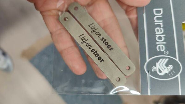 Leren label van 1 op 7cm met de tekst Lief en Stoer, zijn per 2 verpakt en van het merk durable.