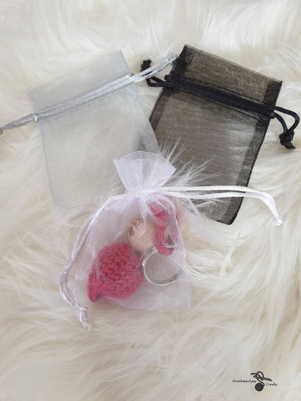 Cadeauzakje voile van 10op 7cm met twee koordjes om dicht te maken. Deze zakjes kan je gebruiken om een sleutelhanger of gelukspoppetje in te steken om cadeau te doen.
