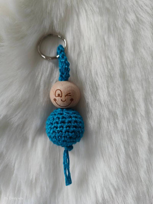 Gelukspoppetje bestaat uit twee houten kralen van 25mm waarvan 1 omhaakt en 1 bedrukt met een gezichtje, gezichtje staat er twee keer op. Ze zijn met de lus ongeveer een 10cm. Ze worden standaard geleverd met sleutelring en verpakt in plastic doorzichtig zakje. Wil je het poppetje cadeau doen kan je er ook een voile zakje bij bestellen, die vind je terug onder de haakbenodigdheden in de webshop. Wil je er graag extra een woord of naam mee aan met letterkralen dan contacteer je mij best even voor je de bestelling plaatst.